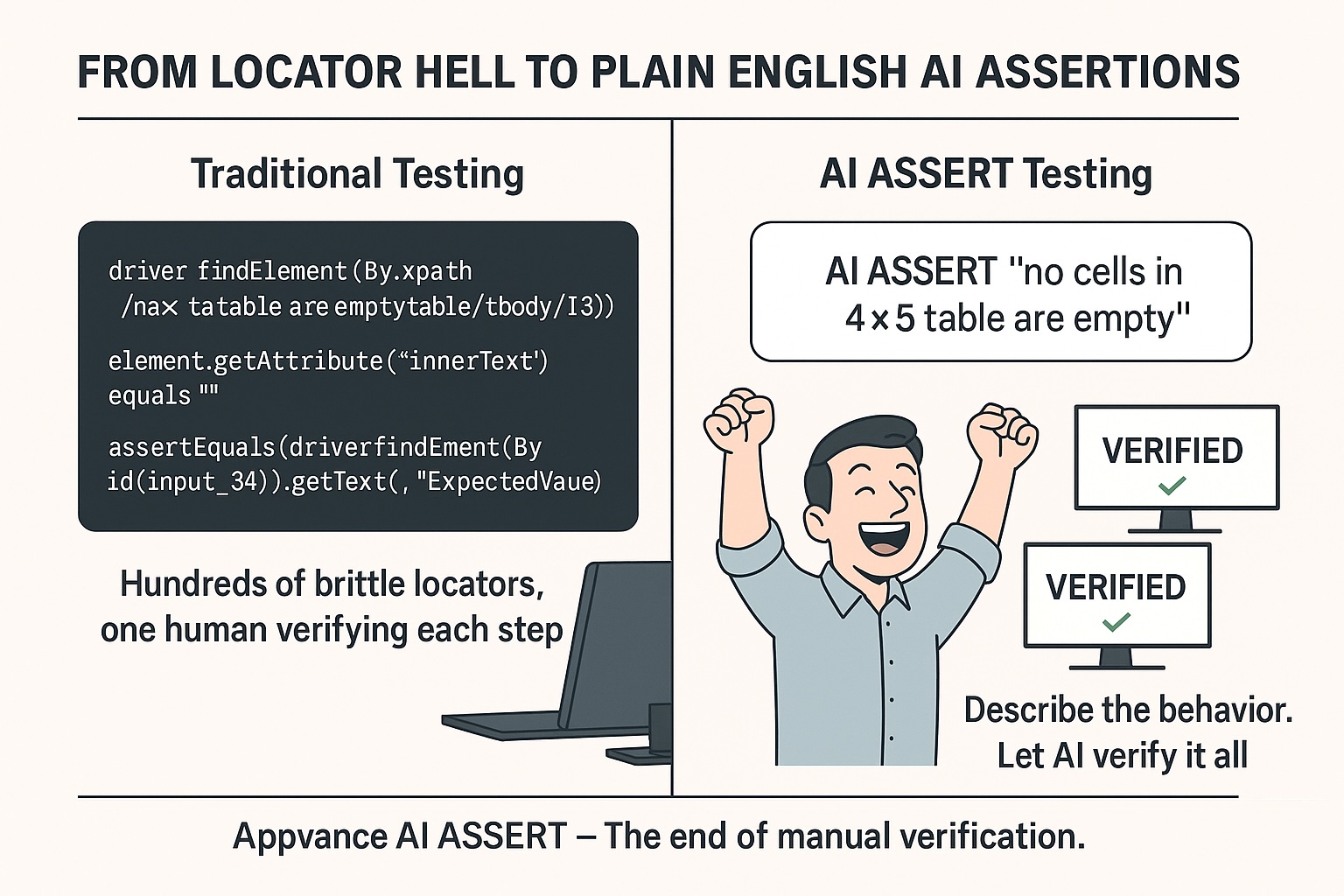 New capability validates complex visual and behavioral outcomes across web and mobile apps—just by describing them SANTA CLARA, Calif., October 14, 2025 /PRNewswire/ – Appvance, the leader in generative AI for software quality, today announced the launch of AI ASSERT, a groundbreaking new capability within its Web Designer module. With AI ASSERT, testers can validate any visual,